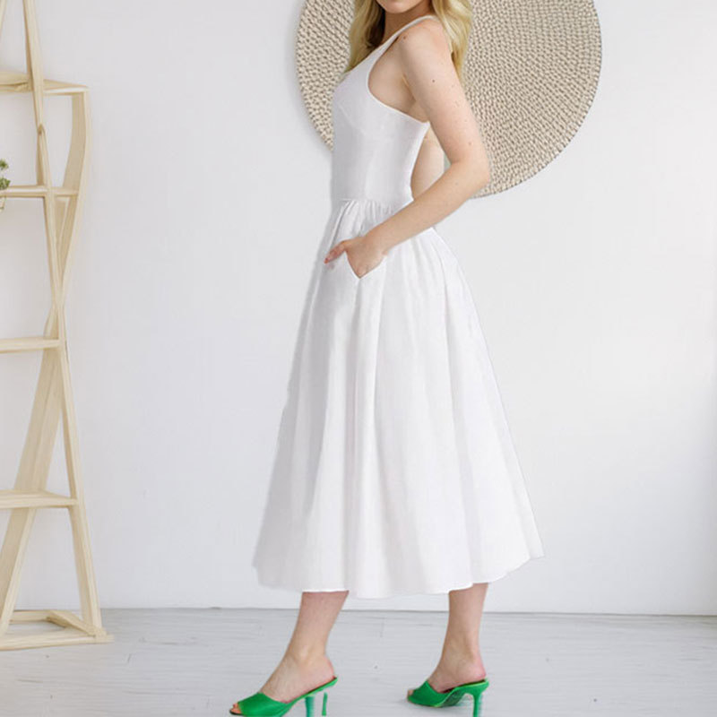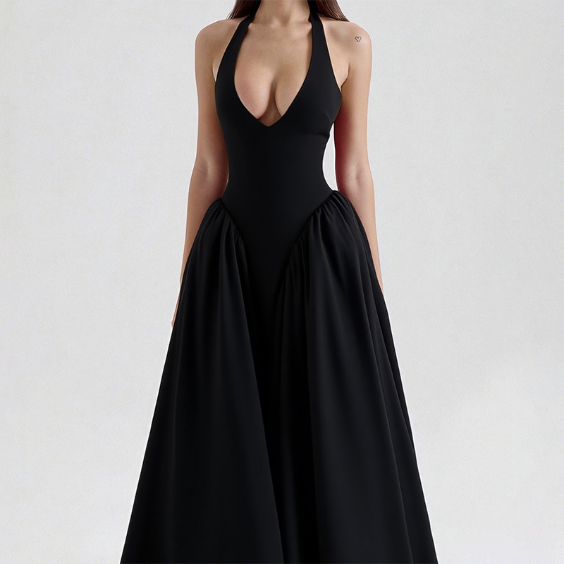 spring women's temperament sexy hanging neck V-neck solid color fashion pleated French dress for women