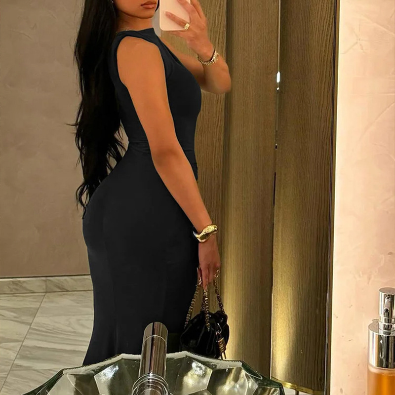 Fashion Temperament Commuting Solid Color Pleated High Waist Pack Hip Slim Jumpsuit Long Dress Women